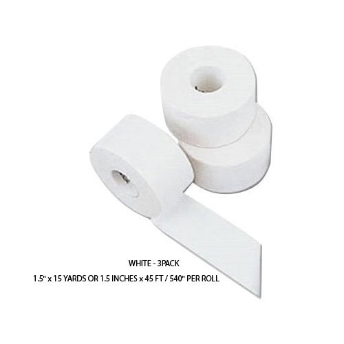 Quality athletic trainers tape used for fitness training, weight lifting, boxing, mma, kickboxing, muay thai, karate, martial arts. Porous cotton backed athletic tape protects joints from sprains and injuries. Conforms to all areas of the body. Reduces irritation from sports activities. Tape ankles, knees, wrists, feet and any skin surface. 1.5" x 15 yards or 1.5 inches x 45 ft / 540" per roll. Color: White. Adhesive on one side. Also good for securing cold or hot packs, and also for taping up sporting equipment such as baseball bats and hockey sticks. Excellent medical tape. Sold in packs of 3.